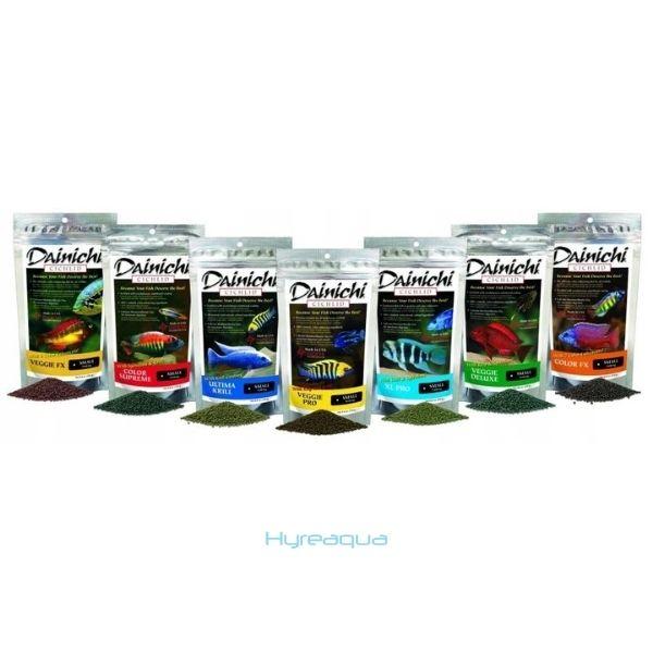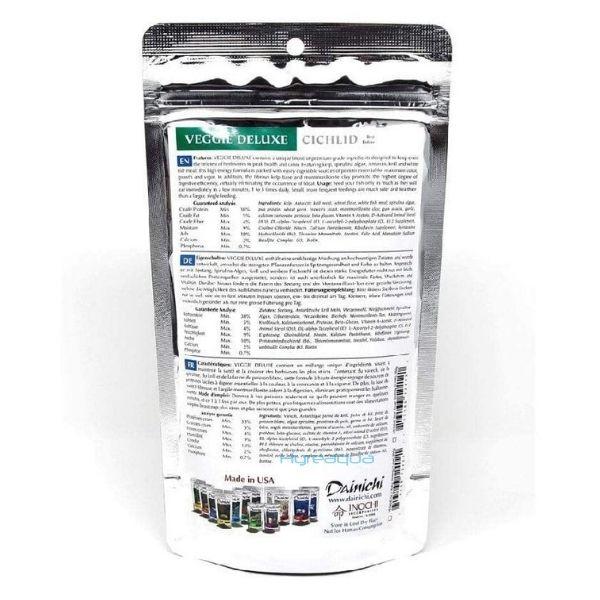 Veggie Deluxe , kaliteli derecede kelp ve spirulinanın benzersiz bir harmanını içerir , otçul hayvanlar için sağlığı ve renkleri zirvede tutmak için tasarlandı. Hem de cichlidlerin büyüme ve canlıklık için gerekli krile yer verirken, karides unu , beyaz balık unu, sarımsak ve pişmemiş sindirim enzimleri bu yüksek enerji formulunu oluşturur.Bu yüksek enerji formülü kolay sindirilebilir protein kaynakları ile doludur ,cichlidlerin büyüme ve canlılığı için gereklidir. Beş renk uygulamasıyla , balıkların erken yaşta olağan üstü canlı renklere kavuşur. Bütün Dainichi yemlerde olduğu gibi ,mineral taneciklerin doğal yemi taklit etmesi için kalsiyum montmorillonite kil vardır, metabolik toksinleri bağlar ve nötralize eder. Hassas nokta, tam olarak kudretli vitaminler, sindirimle ilgili enzimler ve sarımsakla balığın, sağlıklı ve iç parazitlerden uzak olduğunu garanti eder.Bundan başka kil temizle işlemiyle, sindirim sistemi gençleşir. E ve B vitamini kaynağı olarak bugday tohumu unu, sindirim ve besin emilimini hızlandırır.