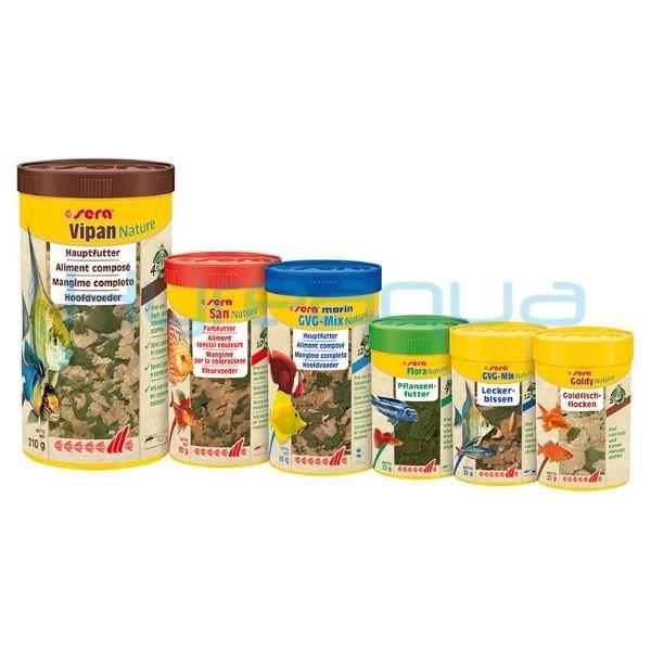 Sera 0 Nip Nature, boya ve koruyucu içermeyen "sera Nature" ürün gamına aittir. Doğaya yakın bileşenlerle zengin bir diyet, eksikliklere karşı en iyi korumadır ve balıkların sağlığını ve canlılığını destekler. Bu nedenle, doğadaki yiyecek türleri Spirulina, Krill veya sinek larvalarından (Hermetia) elde edilen sürdürülebilir böcek yemeği gibi doğal bileşenler içerir. Ambalajın ön tarafındaki işaretler, bu içerikleri ve yiyeceklerdeki miktarlarını vurgulamaktadır.