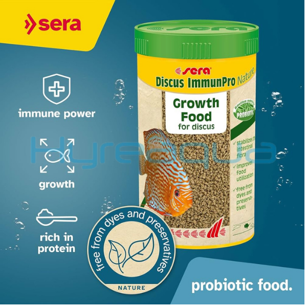 Sera Discus Immun Pro Nature, tüm discus balıkları için yumuşak granüllerden oluşan, boya ve koruyucu madde içermeyen bir büyütme yemidir.