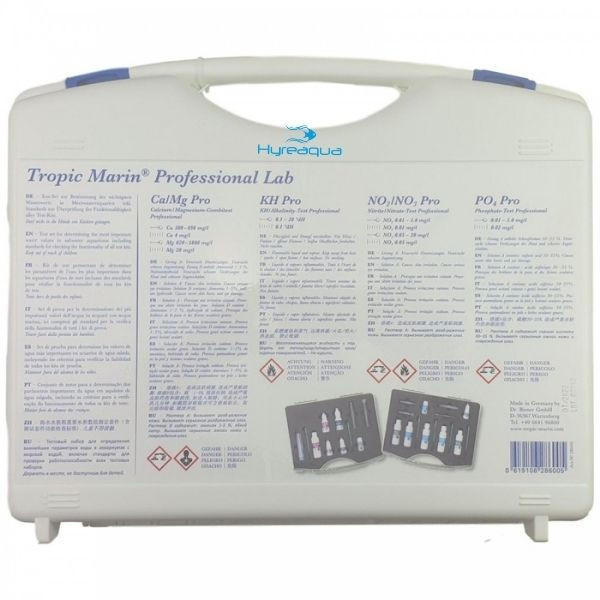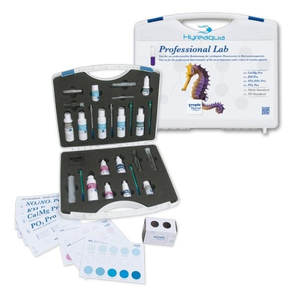 Test-Set Tropic Marin ® Professional Lab , su değerlerinin son derece hassas belirlenmesi için en önemli testleri içerir. Karbonat sertliği, fosfat konsantrasyonu, nitrit ve nitrat içeriğinin yanı sıra suyun kalsiyum ve magnezyum konsantrasyonları, tuzlu su akvaryumlarındaki balıkların ve omurgasızların sağlığı üzerinde belirleyici bir etkiye sahiptir. Bu test seti ile tüm bu değerler kontrol edilebilir. Ek olarak, Multi ve NP standartları, testleri kontrol etmek için iki referans çözüm içerir. Tek tek testlerin bileşenleri, durum içinde iyi sıralanmıştır, böylece karışıklıklardan kaçınılır. Hızlı ve güvenli uygulama için, her bir parametre için her bir talimat kılavuzu ayrıca kısa bir resimli kılavuz içerir.