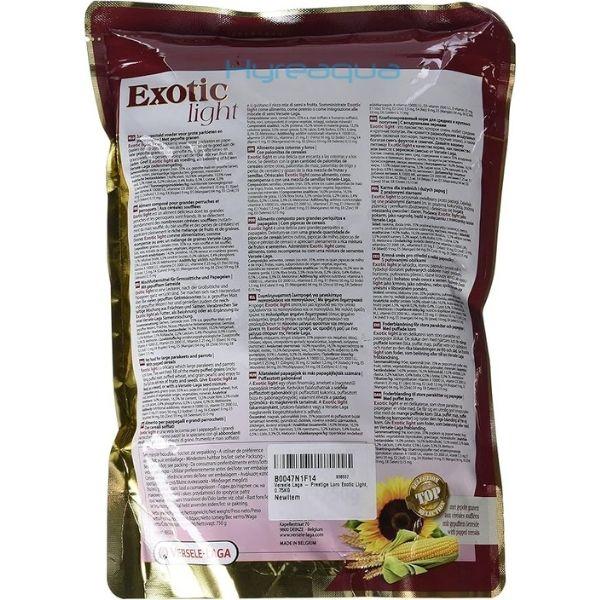 Versele Laga Exotic Light mix tam yem olarak ya da diğer Versele Laga tohum karışımları ile karıştırılarak da verilebilir. Kurutulmuş meyve, patlamış mısır ve buğday ile zenginleştirilmiş olan bu karışıma eklenen birinci kalite tahıllar ile düşük yağ oranı sağlanmıştır. Bütün paraket ve papağan türevleri için uygundur.